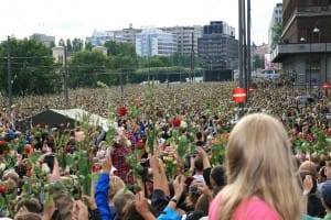 The biggest crowd ever gathered in the Norwegian capital massed into the square and the surrounding streets in a gigantic show of defiance and solidarity. Every person was carrying flowers that were lifted to the sky to testify to the truth of the Crown Prince’s words.