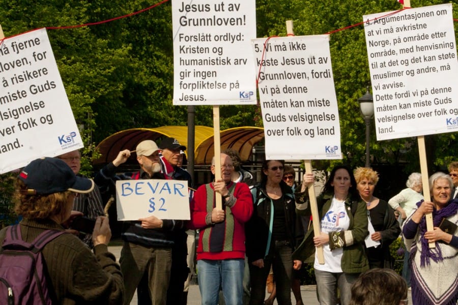 En rekke ytterliggående kristne og en del personer fra det islamfiendtlige miljøet demonstrerte i dag foran Stortinget i forbindelse med at statskirkeordningen mykes opp.